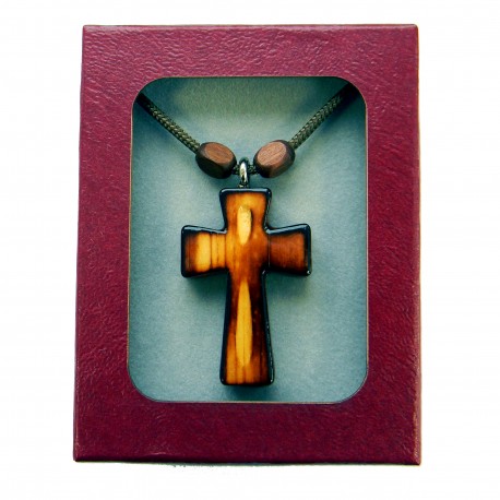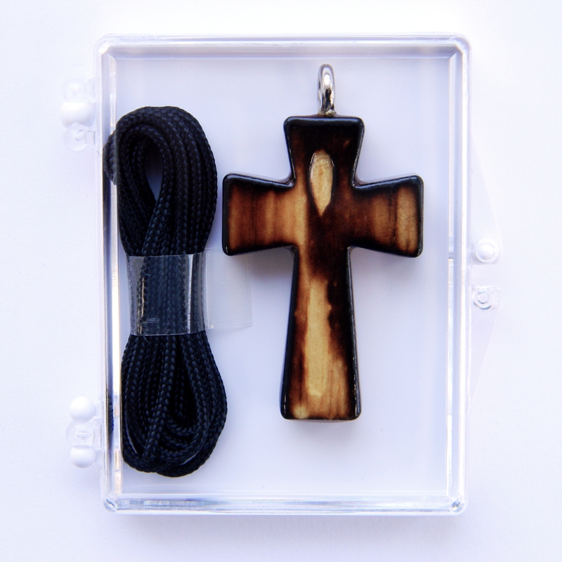 With its front and back motif, cross 9H is made of hand burnt pine.